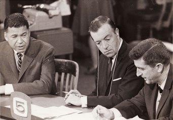 Apopos the story today that Barbara Walters, promoting her new book, told Oprah that she had an affair with former U.S. Senator Edward Brooke (the first African American senator and a Republican one at that), I went back to the archives to find this shot of my father (right) interviewing him (left) on Channel 5 back in the mid 1960s when the Boston Herald Traveler also owned the then WHDH-TV station.